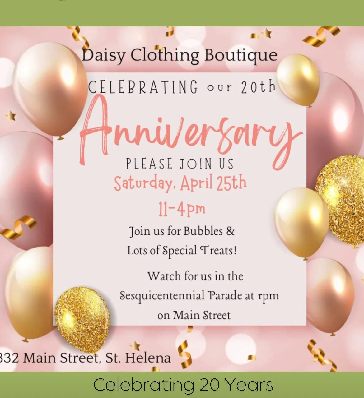 St. Helena is also celebrating it’s 150th anniversary with a parade down our Main Street starting at 1pm! Keep your eye out for Daisy!
